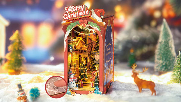 This magical feeling is exactly what the Christmas Street DIY Book Nook captures. A miniature winter village filled with twinkling lights, classic holiday décor, wrapped gifts, and beloved Christmas characters like Santa, snowmen, and teddy bears. Whether you build it yourself or gift it to someone special, this book nook brings warmth, creativity, and holiday wonder to any shelf.