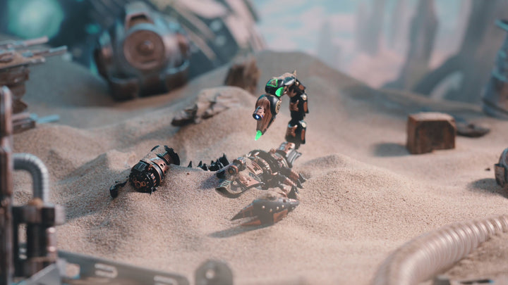 Once powered on, watch the three-claw arm rotate, blades counter-spin, and the scorpion tail strike in lifelike motion. The interconnected gears and linkages perfectly capture the spirit of mechanical art — mesmerizing to watch and thrilling to build!