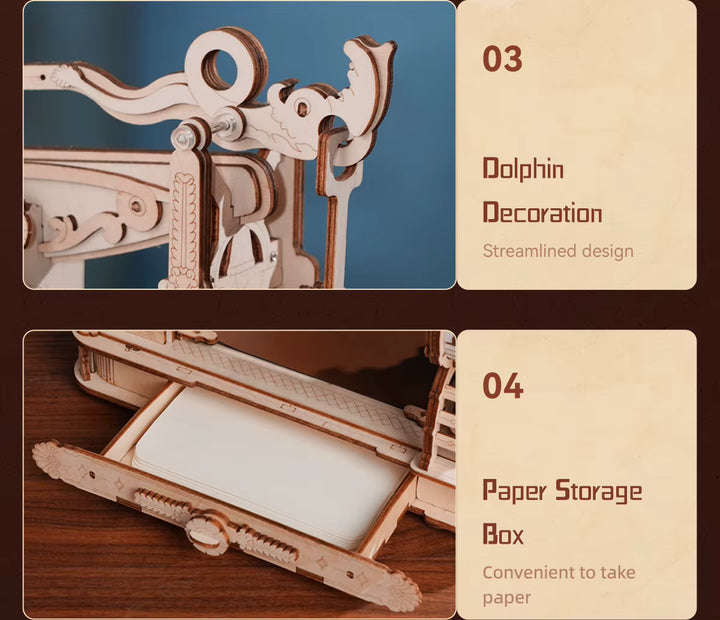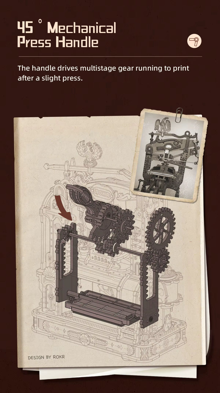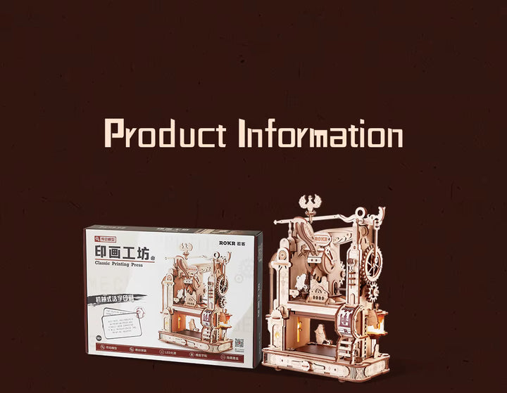Step into the world of classic craftsmanship with the ROKR Printing Press 3D Wooden Puzzle Kit — a stunning blend of mechanical engineering and vintage artistry. Inspired by 18th-century printing technology, this wooden model replicates the charm of a traditional printing press while showcasing a fully functional gear-driven mechanism.