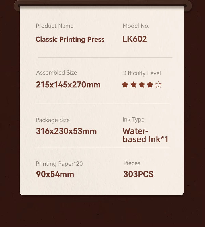 Crafted from eco-friendly, high-quality wood, the model features precise laser-cut parts for smooth assembly. The self-inking system allows you to create authentic prints, while the built-in LED light brings the printing station to life with a warm glow.