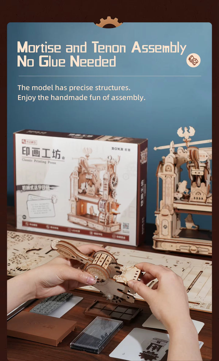 Build history with the ROKR Printing Press 3D Wooden Puzzle Kit. Inspired by 18th-century design, this eco-friendly DIY model features real gear transmission, LED lighting, and a self-inking press system. Perfect for teens and adults who love vintage engineering and creativity.