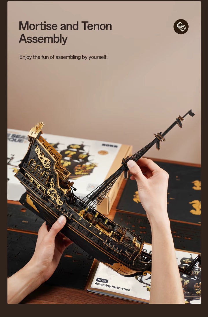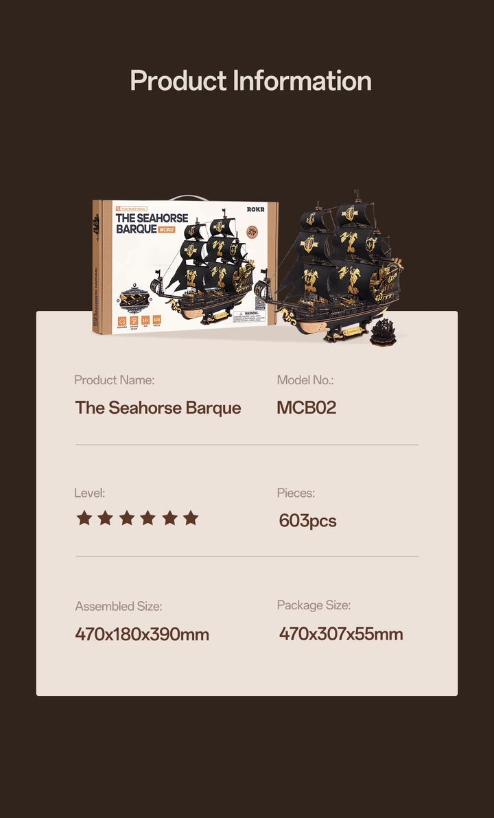 Build the majestic ROKR Seahorse Barque 3D Wooden Puzzle — a 1:100 scale Baroque-era warship with 603 pieces, 3 masts, 13 sails, and gold-foil details. A 10-hour creative challenge and elegant display model, perfect for adults, collectors, and history enthusiasts.